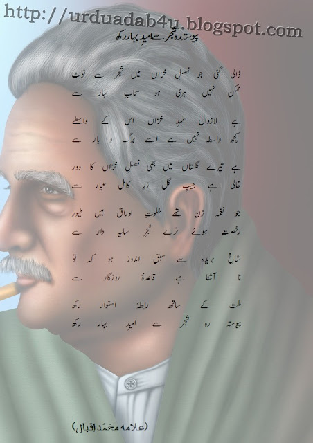 In the following "Pewasta Reh Shajar Se Umeed-I-Bahar Rakh" (Urdu: ?????? ?? ??? ?? ????? ???? ???), a beautiful and famous poem (Urdu: ???) by Allama Iqbal is presented to satisfy your great taste of Urdu poetry.